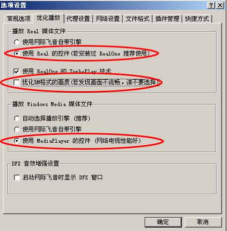 | 打开优化播放设置面板,在“播放Real媒体文件”下请选择“使用Real的控件”建议不要选择“优化RM文件的画质”,在“播放windows media媒体文件”下请选择“使用windows media的控件” |