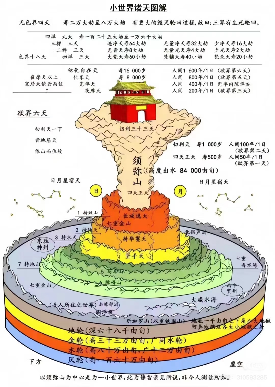 在佛教的世界观里,须弥山是一座无比宏伟的宇宙中心。它又被称作“妙高山”,由众宝构成,高耸入云。我们想象中的世界是平的,但在佛经的描述中,日月星辰其实都环绕在须弥山的山腰运行。这座神山是一个小世界的绝对核心,四周被七重金山和七重香海交替环绕,而在最外层的咸海里,才分布着我们人类居住的“四大部洲”,我们所处的世界就在南边的“南赡部洲”。不仅如此,须弥山本身也居住着天人,山脚和山腰分别是四天王天和忉利天。所以,它既是一个想象中的地理坐标,定义了宇宙的秩序。