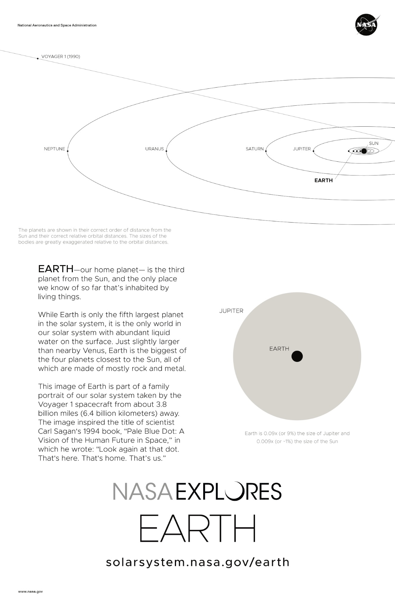 The Pale Blue Dot is a photograph of Earth taken Feb. 14, 1990, by NASA’s Voyager 1 at a distance of 3.7 billion miles (6 billion kilometers) from the Sun. The image inspired the title of scientist Carl Sagan’s book, “Pale Blue Dot: A Vision of the Human Future in Space,” in which he wrote: “Look again at that dot. That’s here. That’s home. That’s us.”