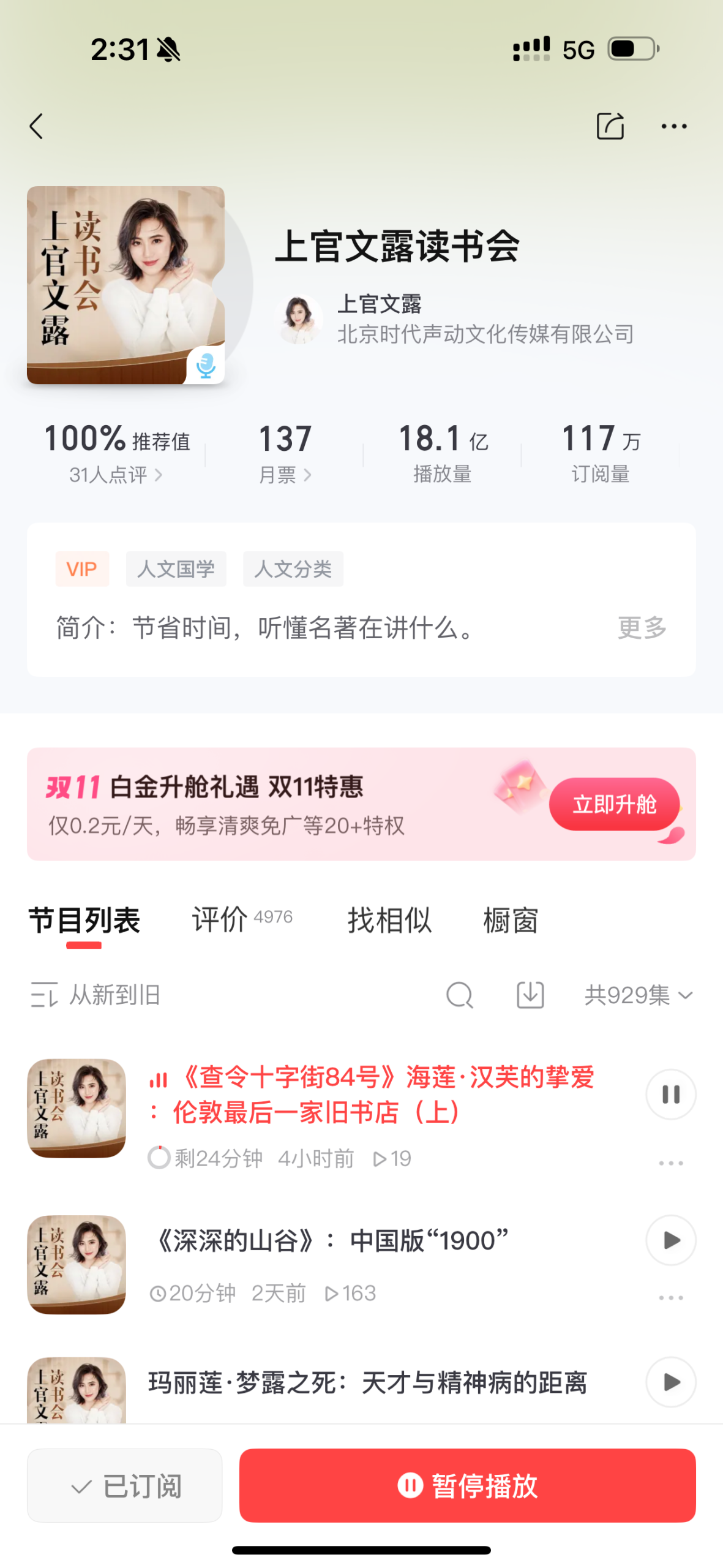 重阳一时突然想起这本爱书人的书,喜马拉雅上查找速听,但没有合适的,都是完整本,想着也许上官文露会有精华本,一打开,原来在我想听时,他们刚上线了查令十字街84 號,84 Charing Cross Road。