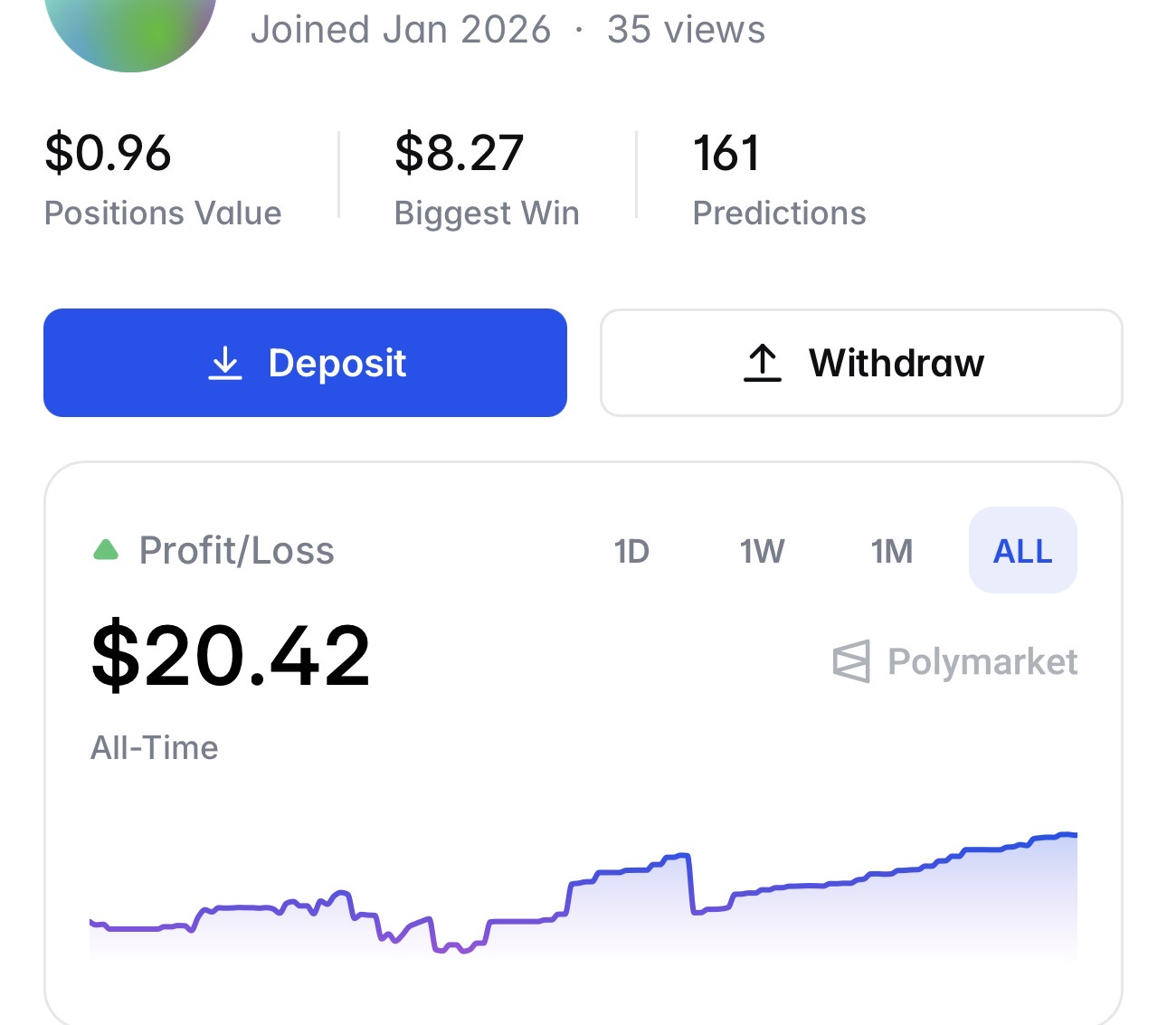 * **低成本試錯:** 在短短兩三個月內完成 161 次預測(Predictions),這意味著平均每天有 1.5 到 2 次的交易頻率。這顯示非常積極地在參與市場,處於大量累積經驗和測試策略的階段,但當前持倉(Positions Value)僅 $0.96,總獲利 $20.42。這顯示操作者具備極強的風險控制意識,完全將早期階段定位為「測試與收集數據」,而非賭博盈利。