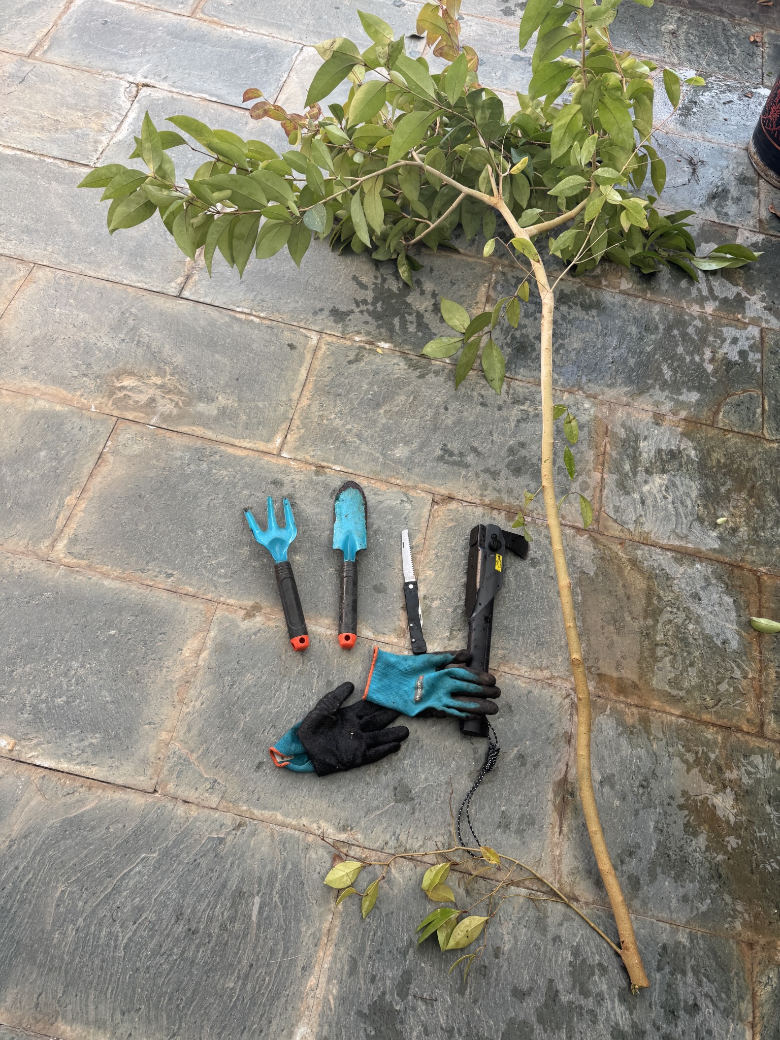 為桂花施藥幾次後才發現有一根枝條枝葉茂盛,但越看越不像桂花,在AI的幫助下才知道是飛鳥攜來的女貞子,不是枝條已經是小樹,為了桂花必須剷除,於是在立春前備好工具,扒土一試,果然根係發達,盤根錯節,鋸,斧,鏟,鈀齊上,斬枝除根!。