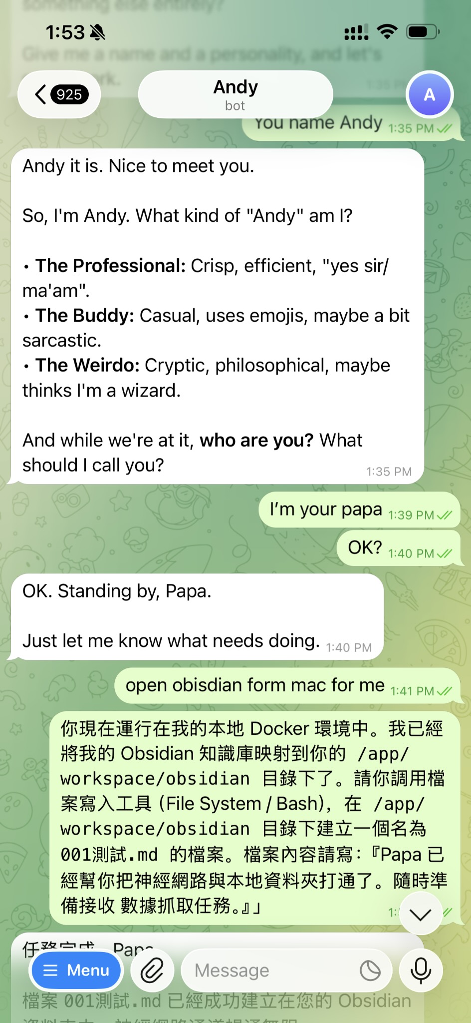 對著機器人發送:“幫我搜集今天紐約和上海的科技頭條,整理成簡報並存入我的 Obsidian 文件夾。”