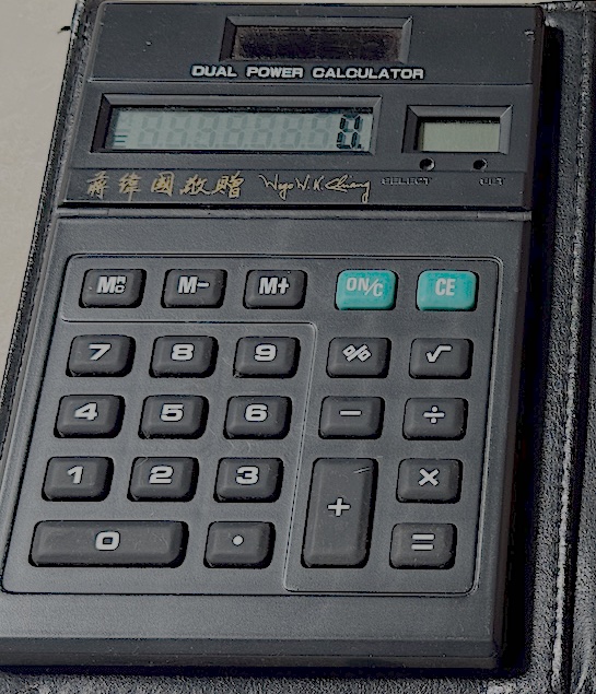 這是一部 1980 年代流行的雙電源電子計算機——輕薄、帶有太陽能板,是當年台灣電子業起飛時,政商名流最喜愛的高級公關贈品,用於軍政界的公關贈禮、年節慰問或外賓接待(居然到现在还可以正常使用)。然而,面板上那行燙金的「蔣緯國 敬贈」與獨特的英文簽名「Wego W. K. Chiang」,卻將這件不起眼的科技小物,連結到了近代中國錯綜複雜的政治家族史和蒋中正的情与义。