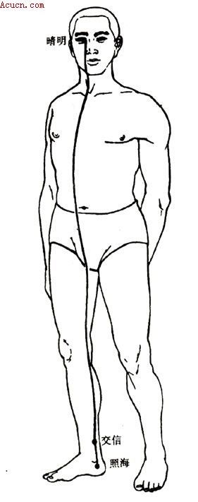 [交会穴]照海(足少阴),交信(郄;足少阴),睛明(足太阳)。