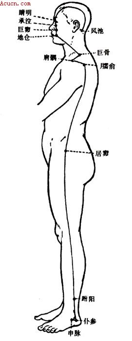 阳蹻者,足太阳之别脉,其脉起于跟中,出于外踝下足太阳申脉穴,当踝后绕跟,以仆参为本,上外踝上三寸,以跗阳为郄,直上循股外廉,循胁后髀,上会手太阳、阳维于臑俞,上行肩外廉,会手阳明于巨骨,会手阳明,少阳于肩髃,上人迎,挟口吻,会于手足阳明,任脉于地仓,同足阳明上而行巨髎、复会任脉于承泣,至目内眦与手足太阳、足阳明、阴蹻五脉会于睛明穴,从睛明上行入发际,下耳后,入风池而终。(按:阳蹻交会穴《甲乙》无风池、风府,据《难经》补。) |