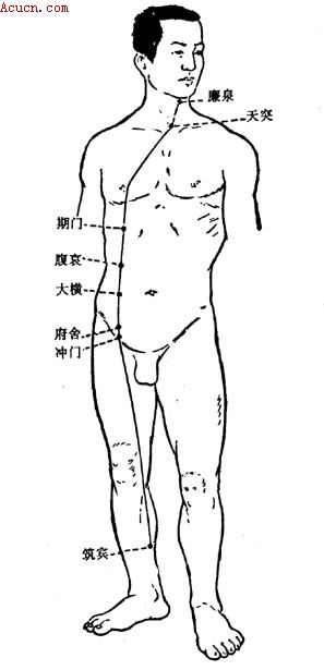 筑宾(郄;足少阴),冲门、府舍、大横、腹哀(足太阴),期门(足厥阴),天突、廉泉(任脉)。此外,手厥阴心包经的内关穴通于阴维。