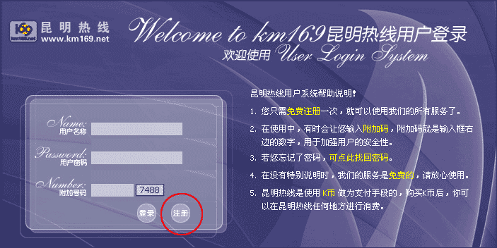 注册成为昆明热线注册用户后,您就可以享受昆明热线为您提供的各种增值服务以及在昆明热线进行购物,游戏,抽奖等网上活动,注册是完全免费的,注册成功后您将会有一个帐户用来管理您的K币。如何注册为昆明热线注册用户? 1,访问http://pay.km169.net/